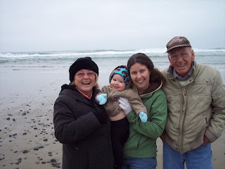 As my parents and grandfather were in town visiting, we thought it'd be fun to take Riley out to the coast. This was her first time going to the beach and seeing the ocean, well seeing any type of body of water actually. As it is winter, it was a bit cold, so we all had to bundle up. Riley seemed to enjoy the trip, although I'm not sure she knew what to make of all the waves/sand.